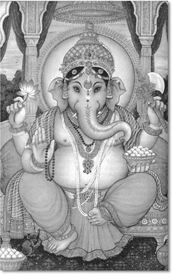 OM Sri Ganeshaya namah, "Hail Lord Ganesha!" is the mantra to the elephant-headed Hindu god repeated by devotees at the commencement of any important undertaking or spiritual gathering, for the removal of obstacles and the attainment of success. With his ungainly form, comically riding a mouse or rat as his steed, Ganesha is the most popular deity among Hindus. Millions of devotees celebrate his Chathurti Festival in August/September each year, when decorated statues of Ganesha are carried through the streets of every town and village and cast into rivers and oceans in a spectacular closing of the Festival. Most Hindu homes and businesses have a statue of Ganesha at their doorway, and a picture of his humorous but compassionate form in their family shrine. Who then is Ganesha, and what can he teach us?